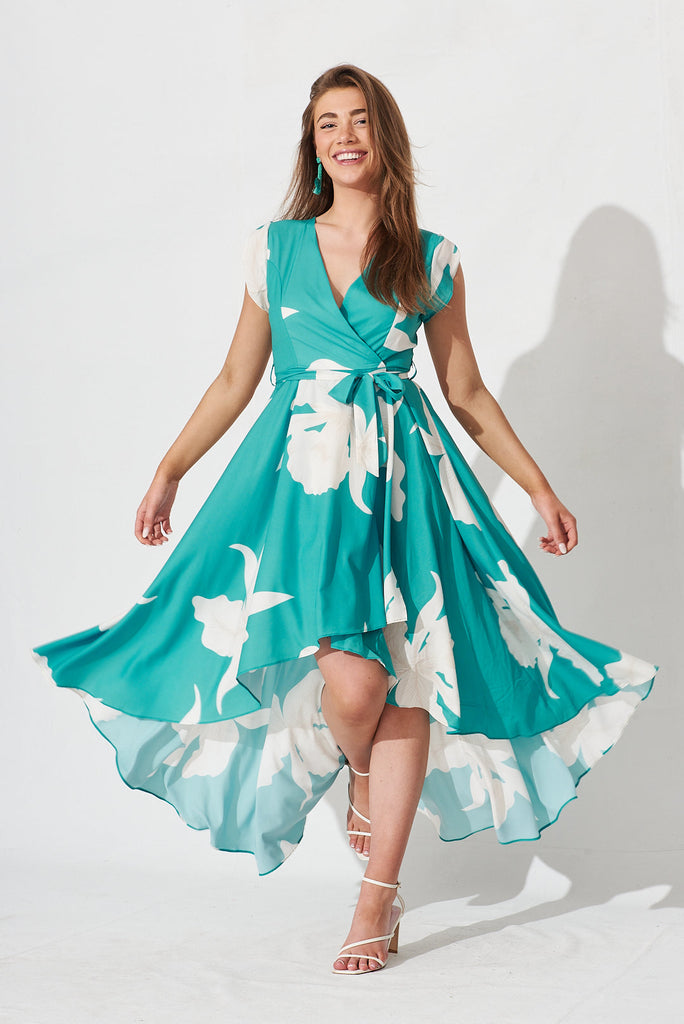 Nadine Maxi Dress In Beige With Yellow Print Satin