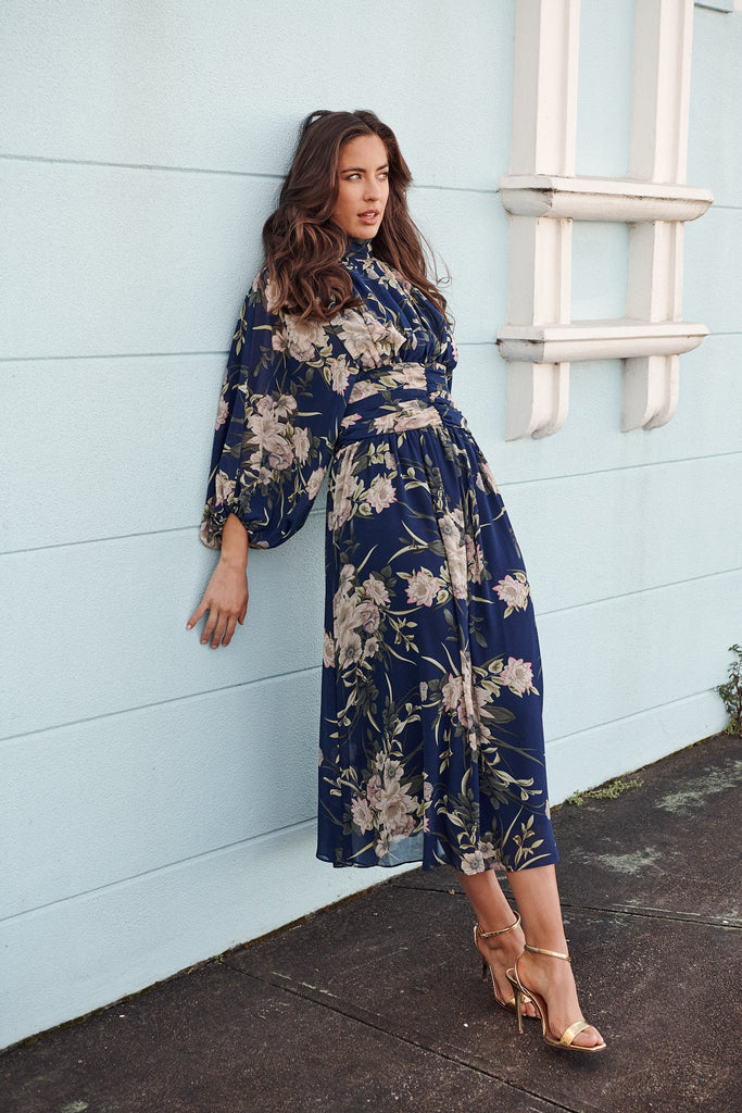 Aceline Midi Dress In Navy Vintage Floral Chiffon