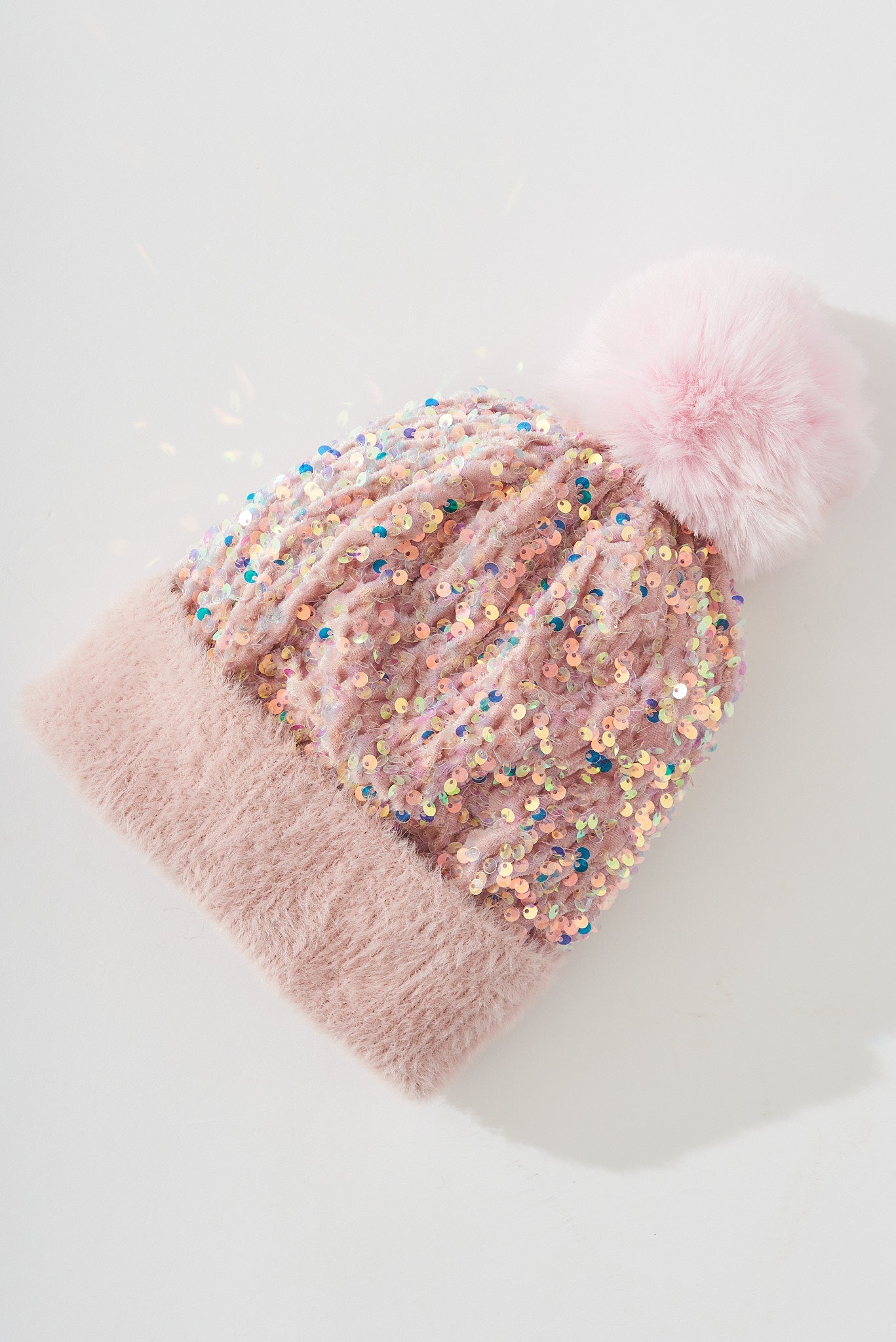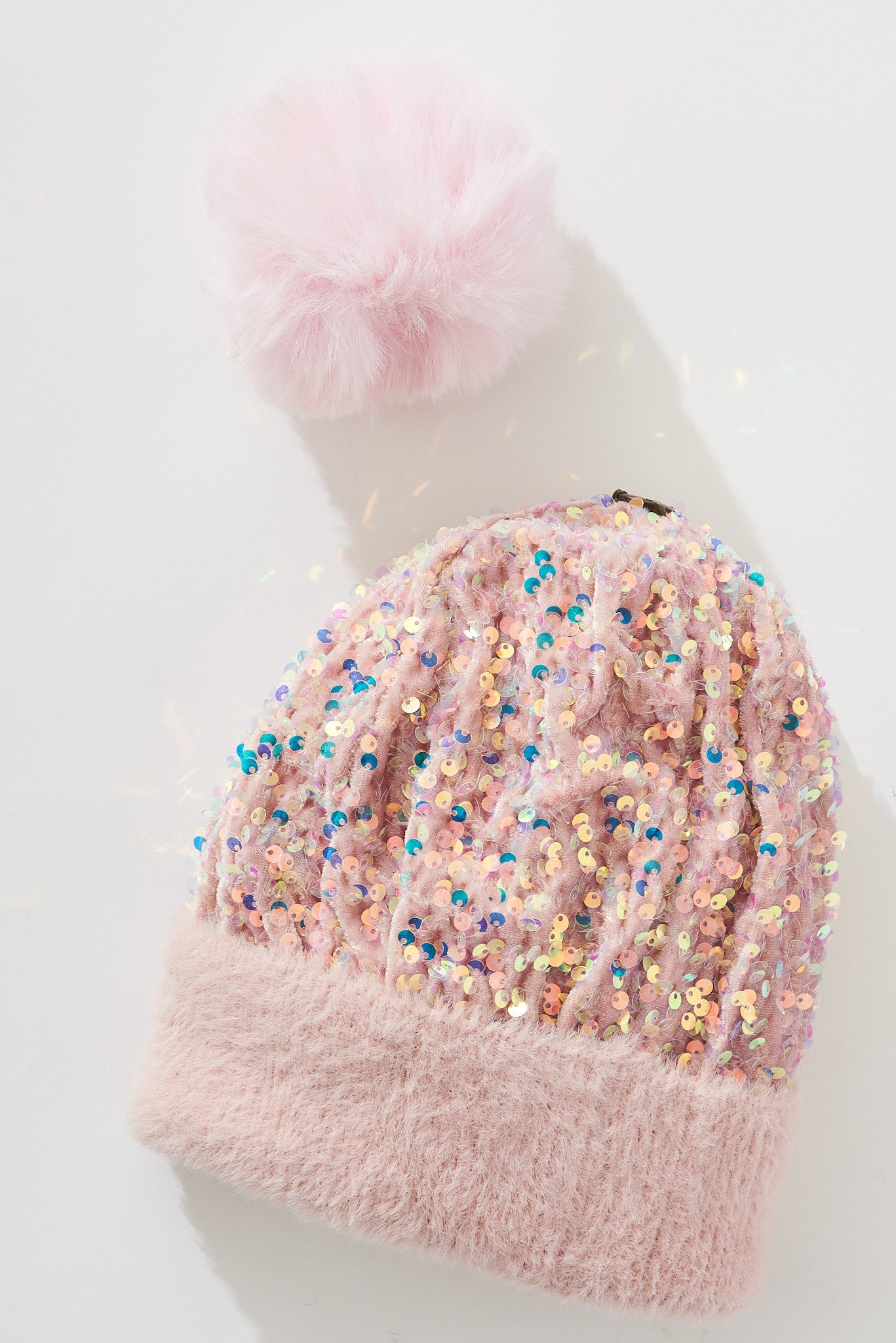August + Delilah Figuera Knit Beanie In Pink Sequin
