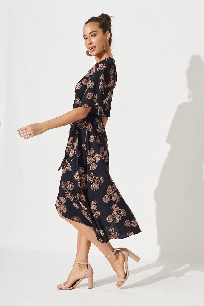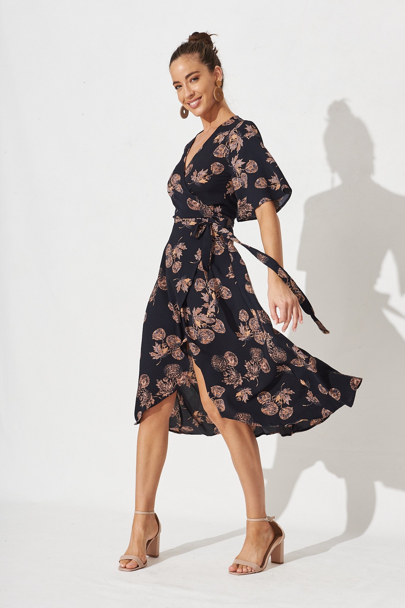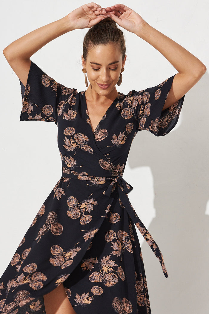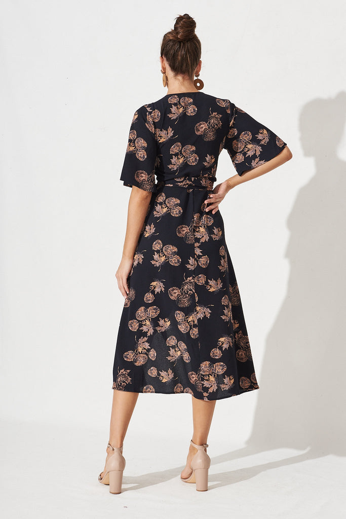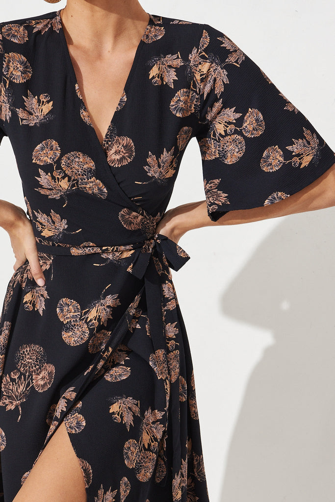 Bellerose Midi Wrap Dress In Charcoal With Apricot Floral