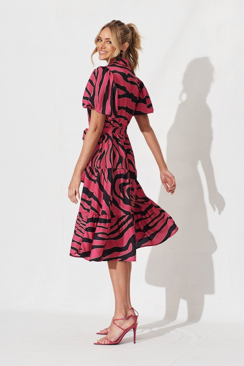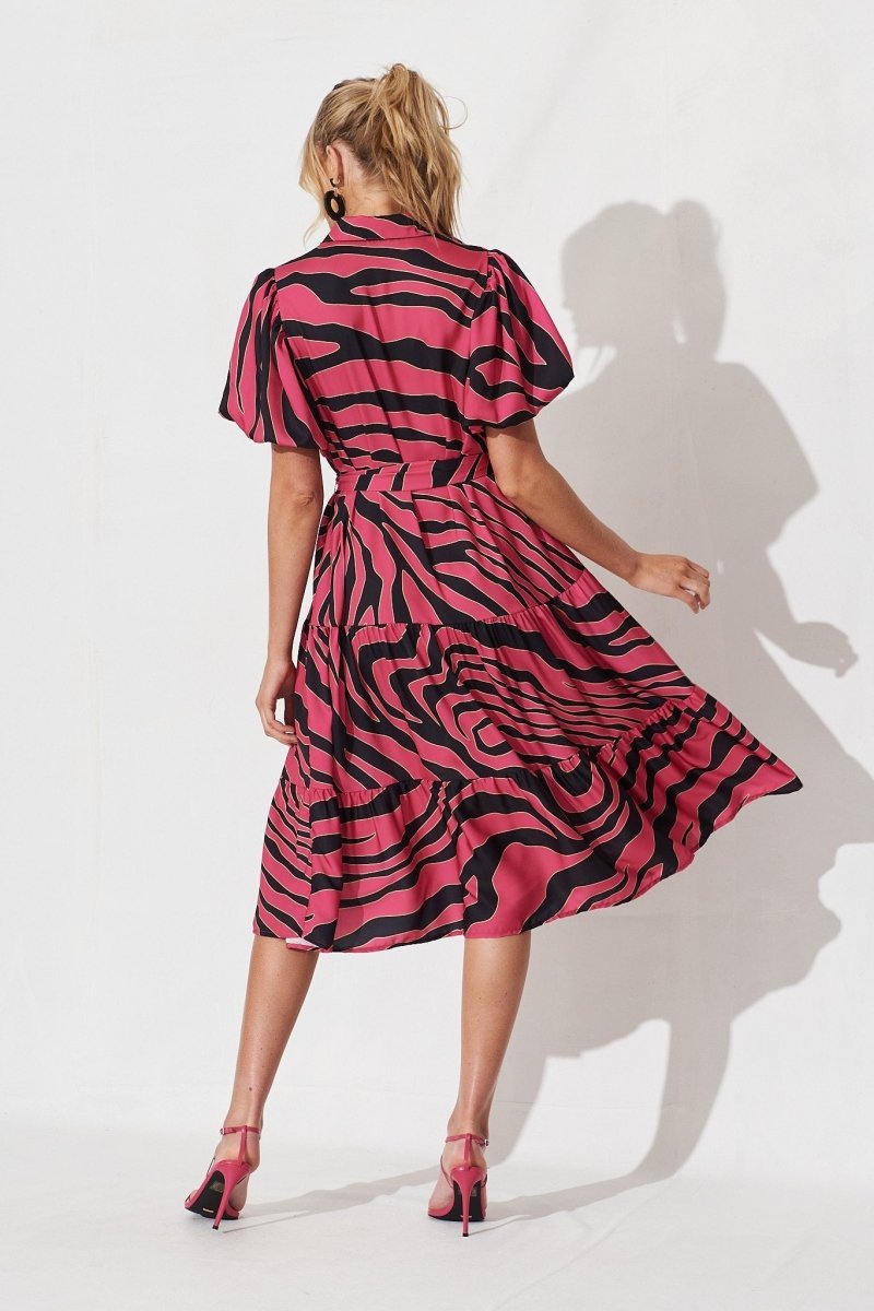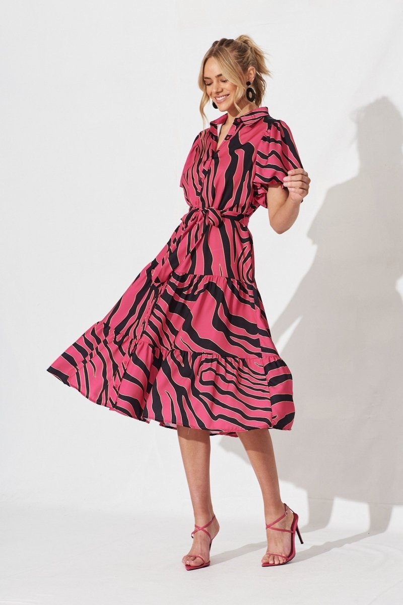 Cantia Midi Shirt Dress In Magenta With Black Print