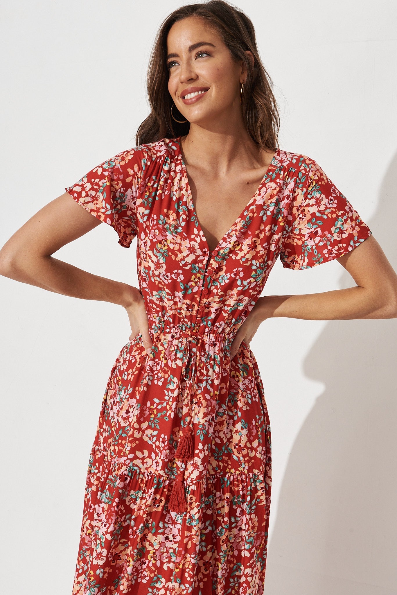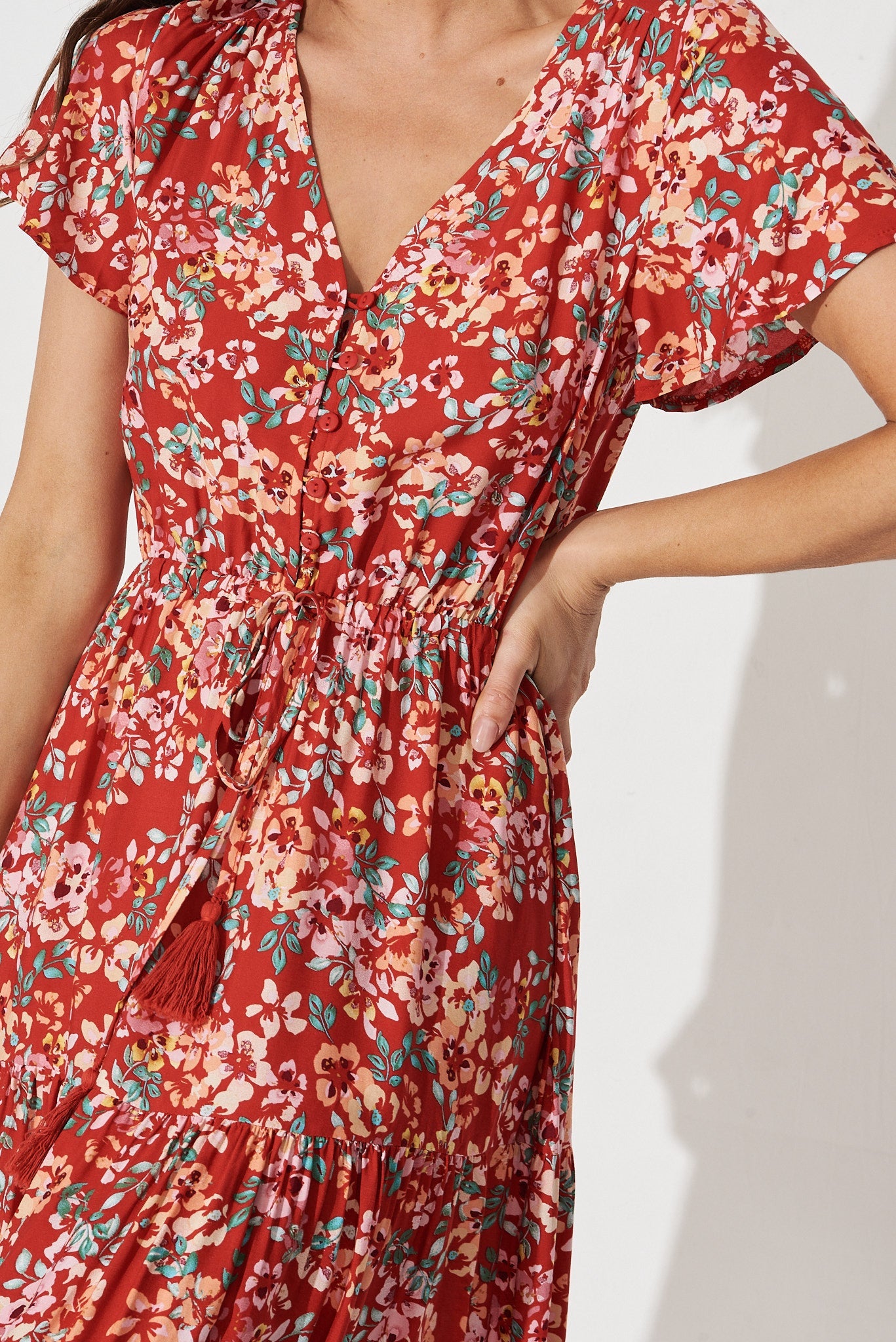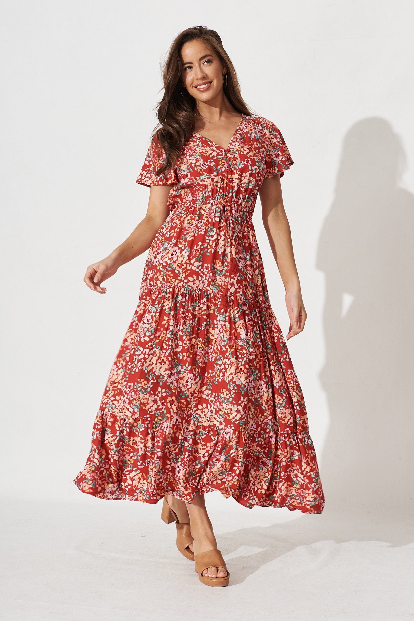 Elxi Maxi Dress In Red With Beige Floral