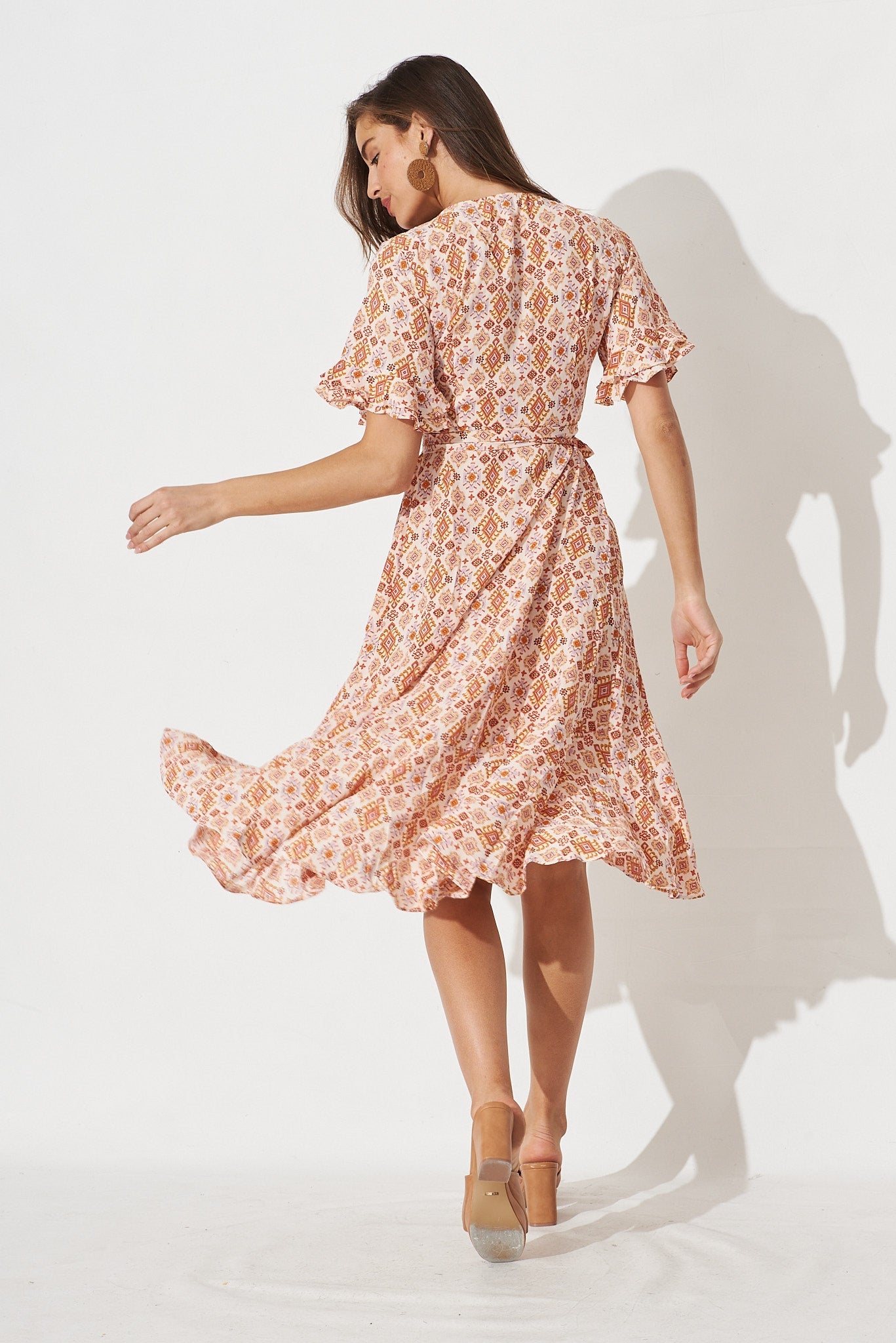 Felicidad Midi Wrap Dress In White With Rust Aztec