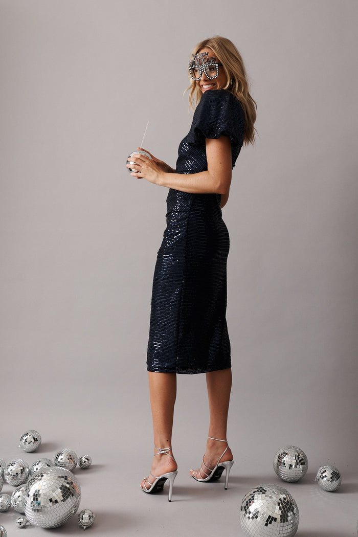 Make a sparkly statement in our Frosted Midi Dress! This show stopping number will ensure all eyes are on you at your next special event! Style it with heels & a nude clutch for a refined, feminine look.