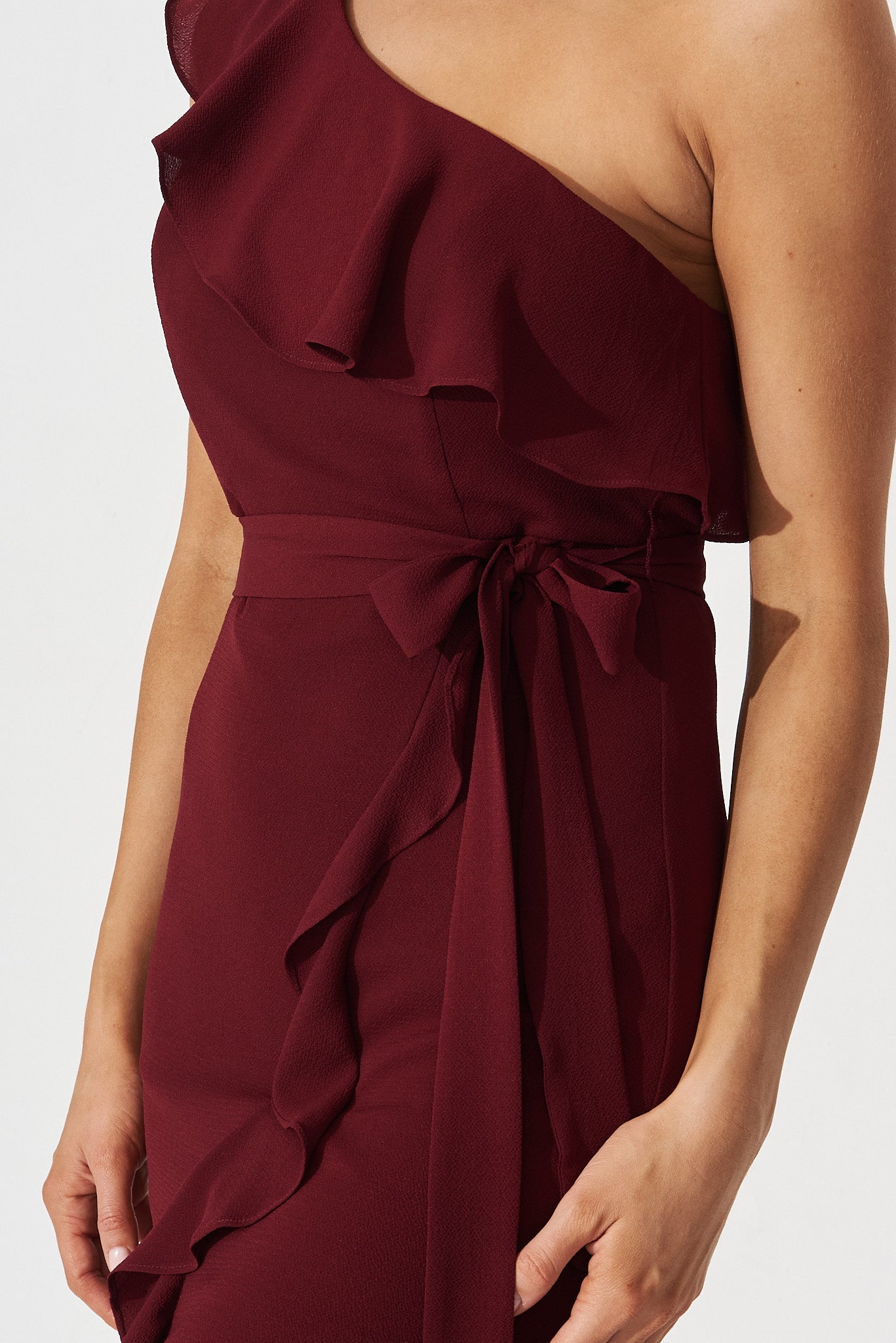 Look stylish in our Glinds Midi Dress! This gorgeous dress is an elegant choice for your next formal occasion. Featuring a one-shoulder neckline with ruffle detail on the top half of bodice & skirt, along with waist tie. Wear it out to any special events coming up with heels & statement jewellery.