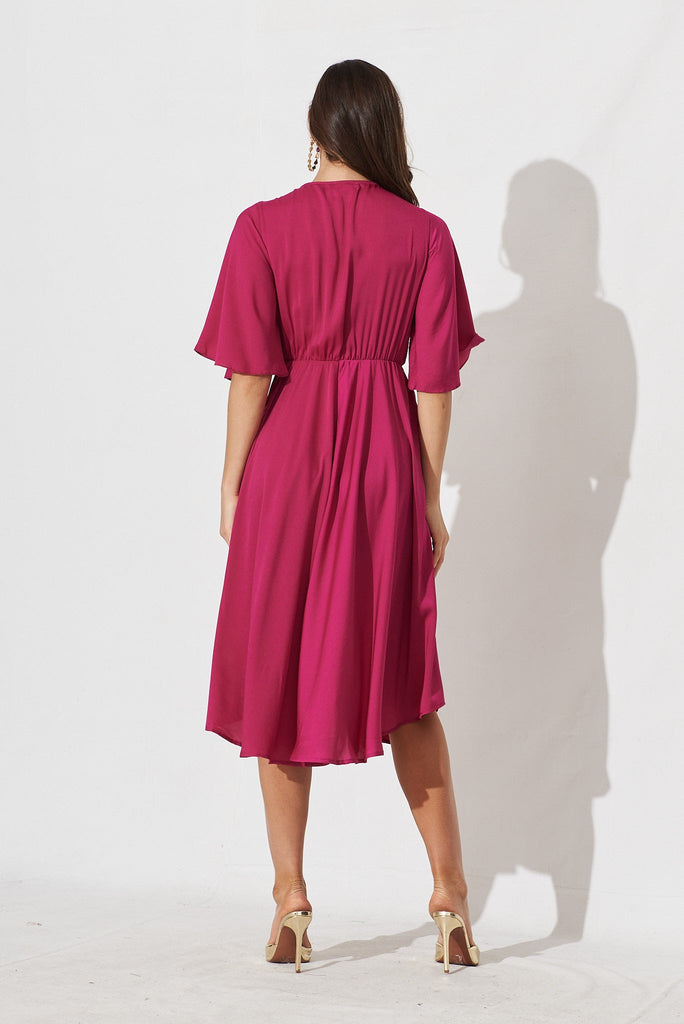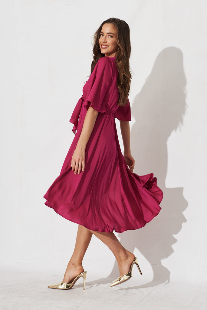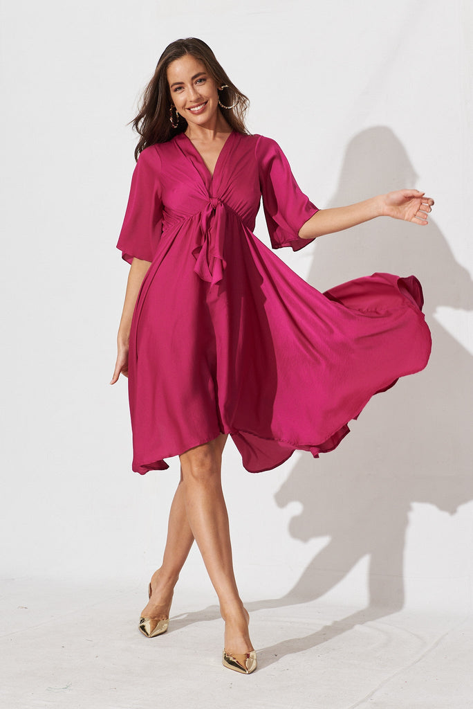 Feel feminine and relaxed in the Helsinki Dress in Pink Satin! Made from a satin-like fabric that flows beautifully and feels so comfortable on the skin, this style features an elasticised waist, fluted hem and front tie detailing. The draped bell sleeves and fluted hem can be perfectly paired with simple heels and pearl earrings for a refined and romantic look!