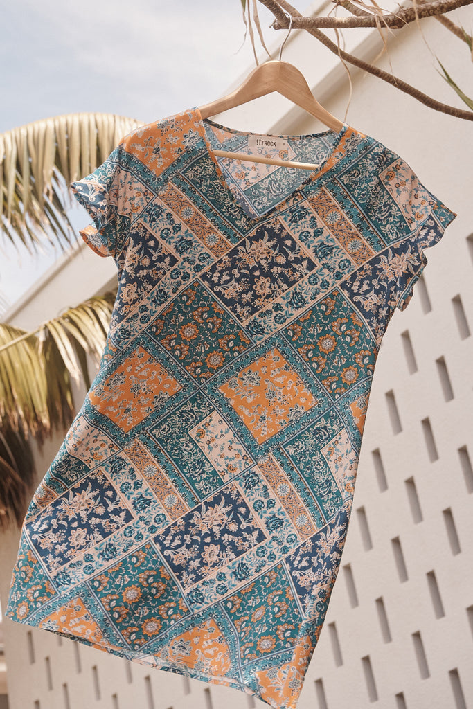 Jacoba Shift Dress In Navy And Blue Tile Print