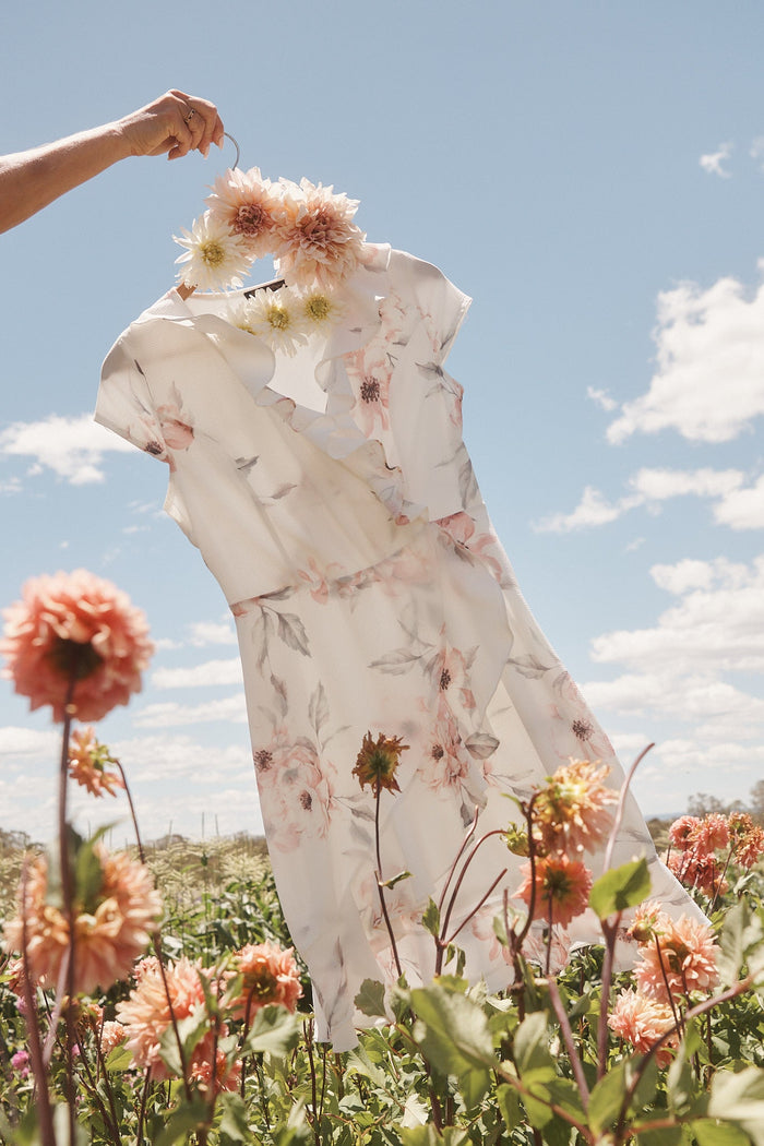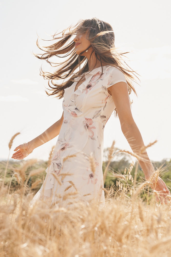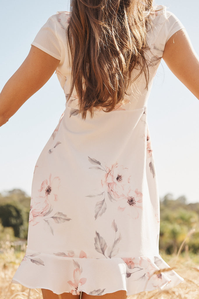 Kaylie Mock Wrap Dress In White With Blush Floral Crepe