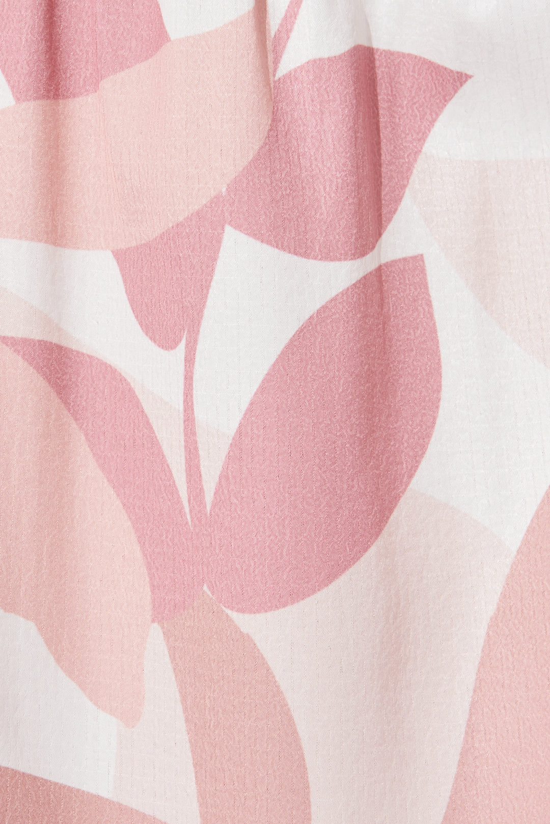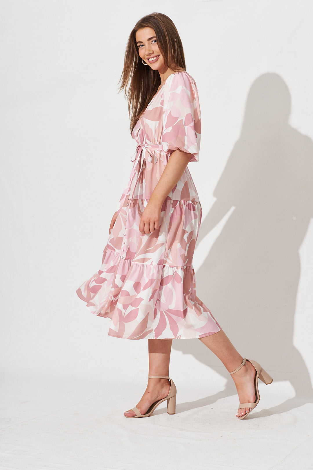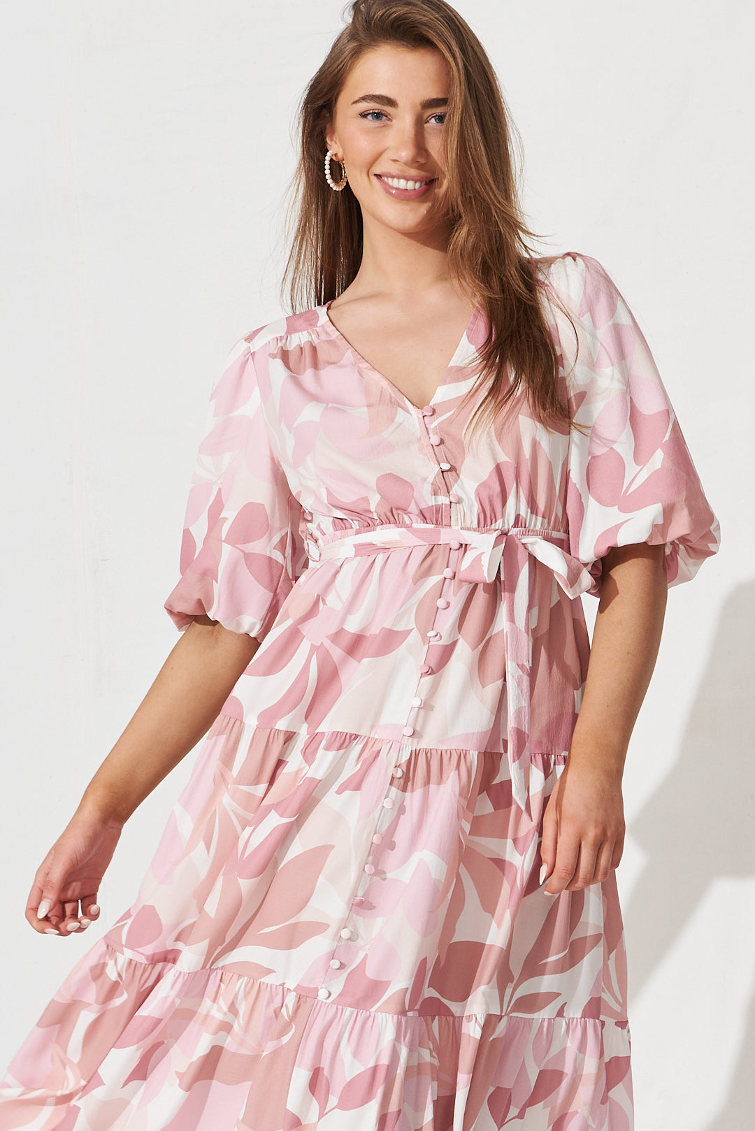 Koami Midi Dress In White With Pink Multi Leaf Print