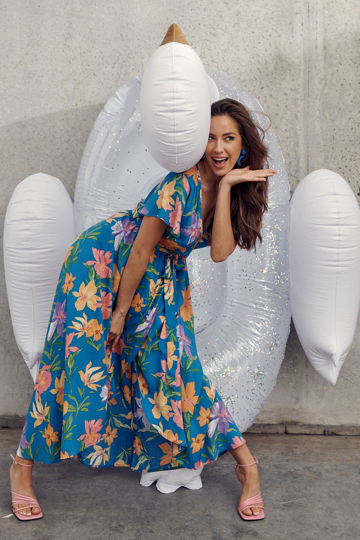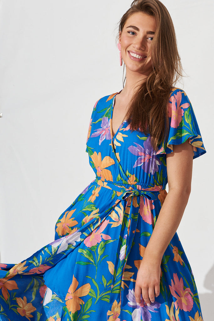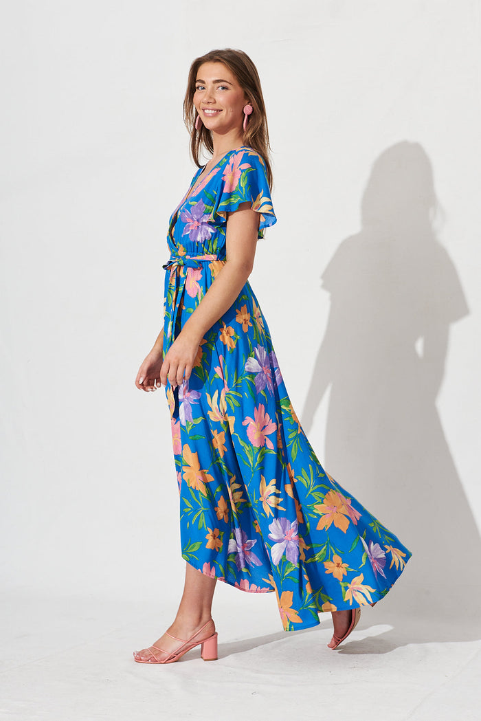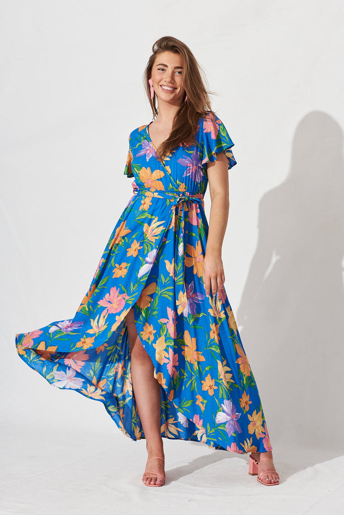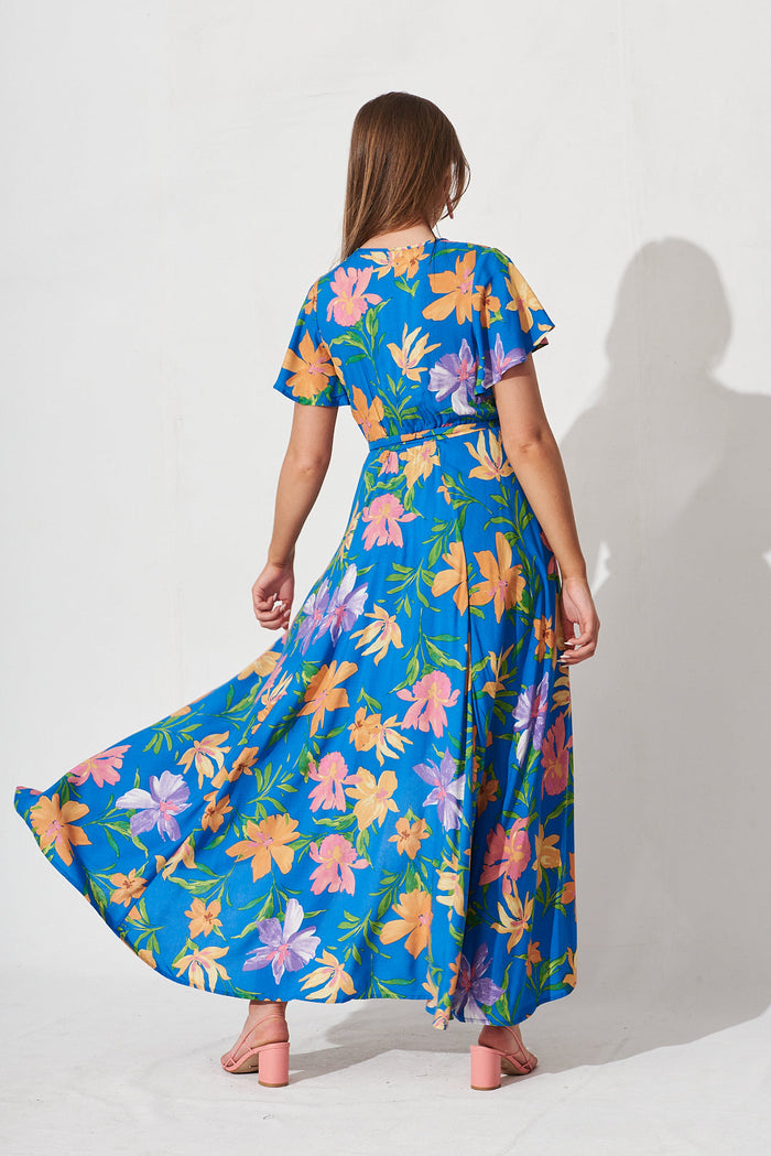 Lorelei Maxi Dress In Blue With Orange Multi Floral