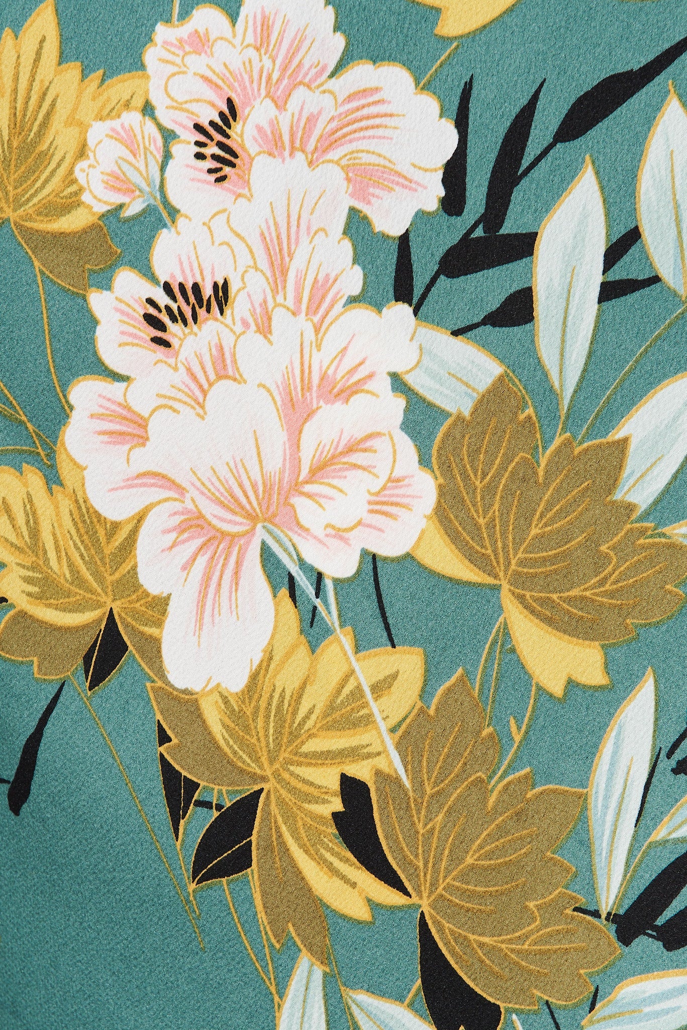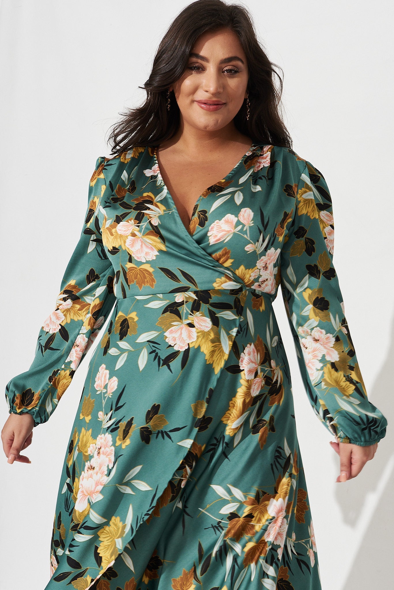 Mackenzie Midi Wrap Dress In Green With Blush Floral Satin