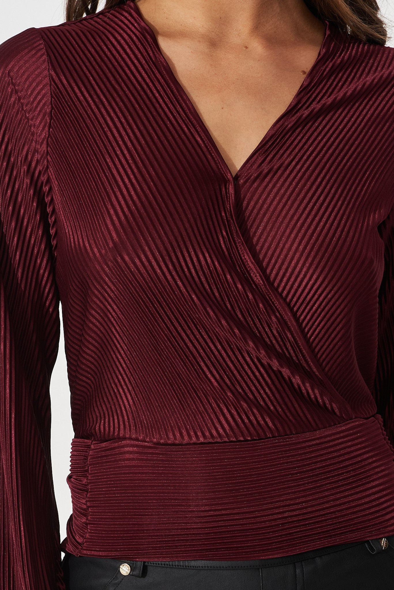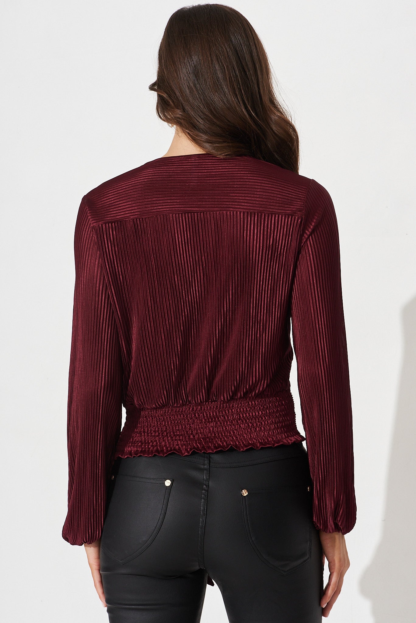 Turn heads in our Minny Top! This vintage-inspired piece features v-neckline, long sleeves & tie-up detail at the front to keep you comfortable. Its elegant silhouette and luxe plisse finish make it perfect for date night or that evening occasion.