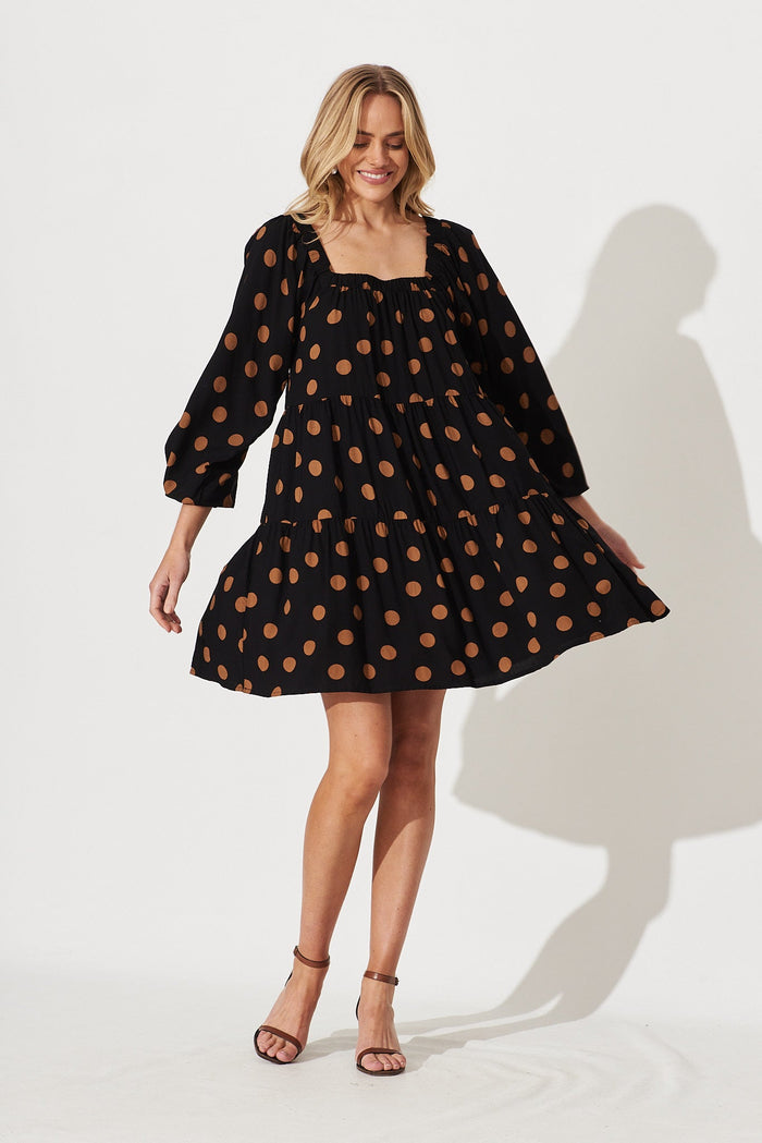 Noni Smock Dress In Black With Brown Polka Dot