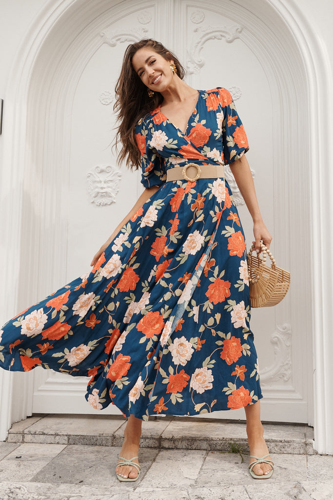 Our Ronda Maxi Wrap Dress is feminine and timeless. Fit and Flatter your shape and style this dress into your party wardrobe.