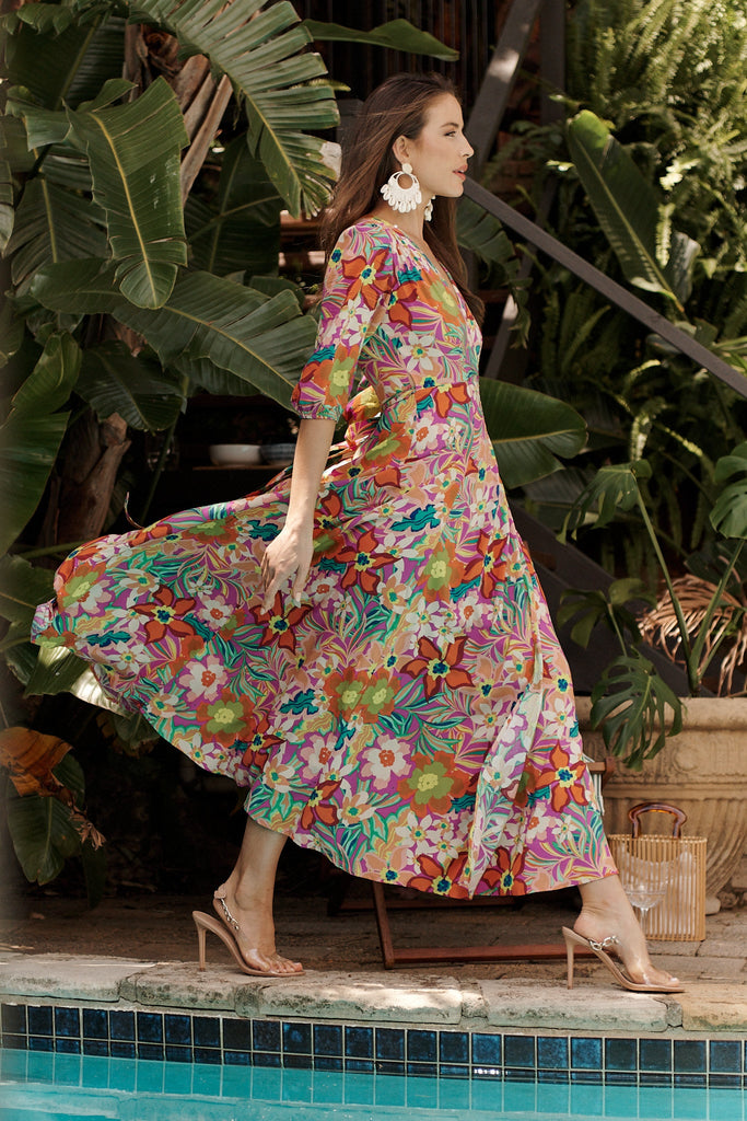Our Ronda Maxi Wrap Dress is feminine and timeless. Fit and Flatter your shape and style this dress into your party wardrobe.