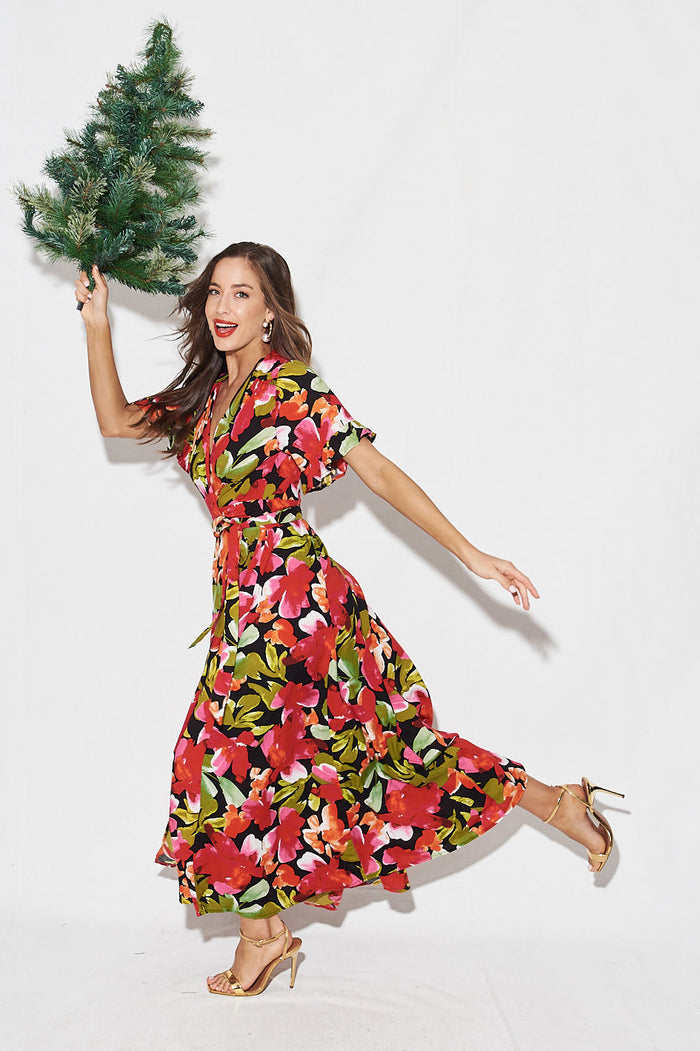 Rondal Maxi Wrap Dress In Black With Multi Floral