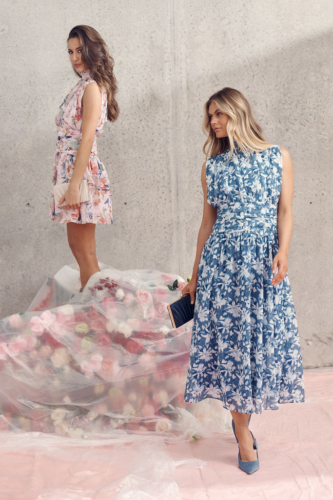Rosamine Maxi Dress In Blue With White Floral Chiffon