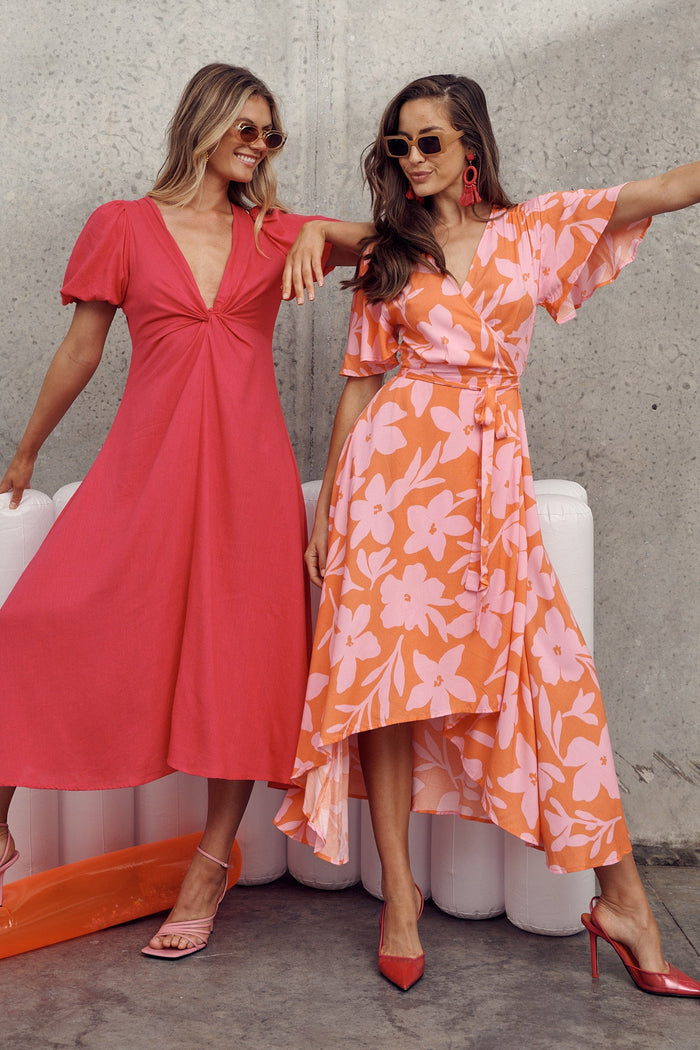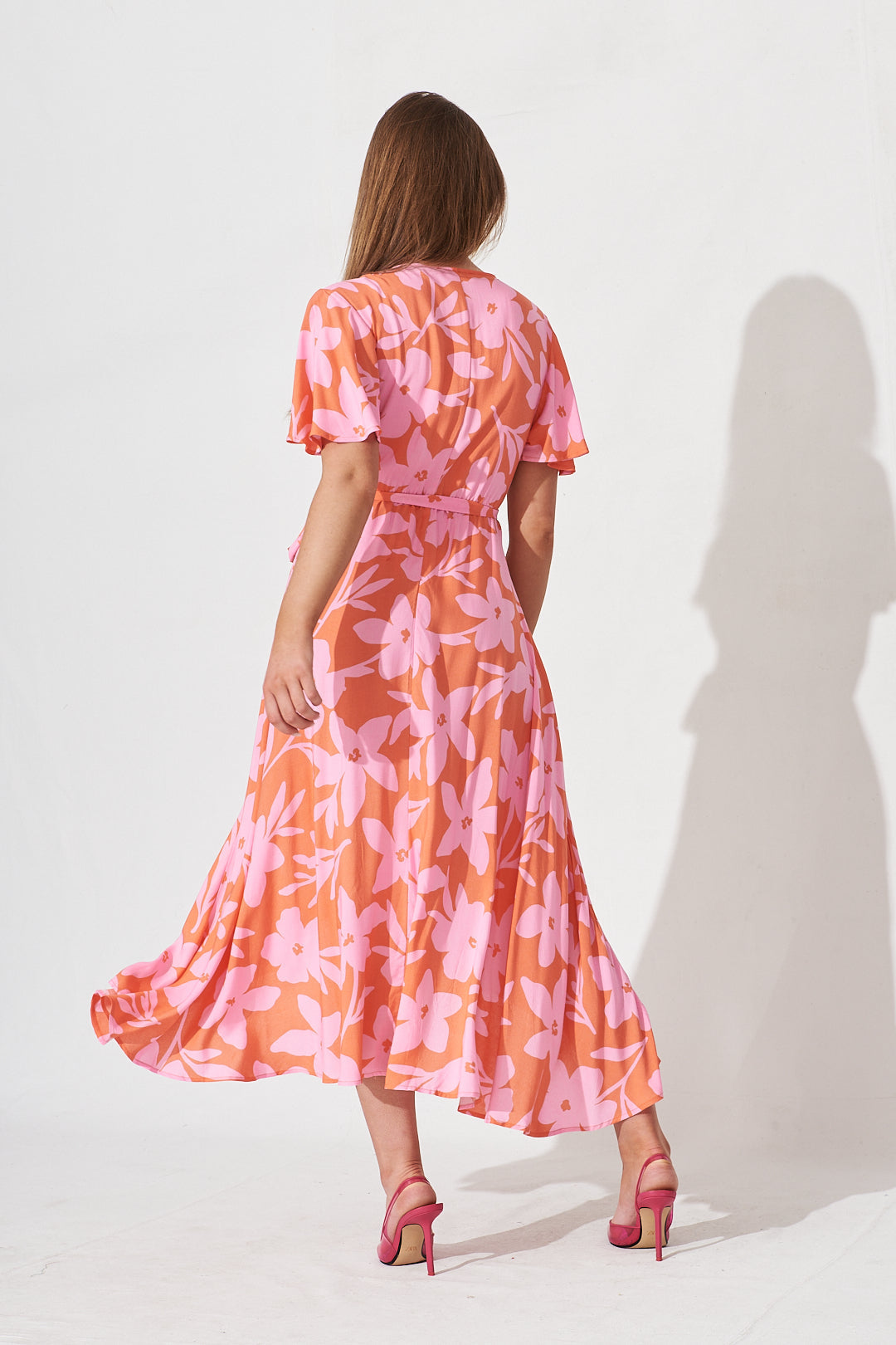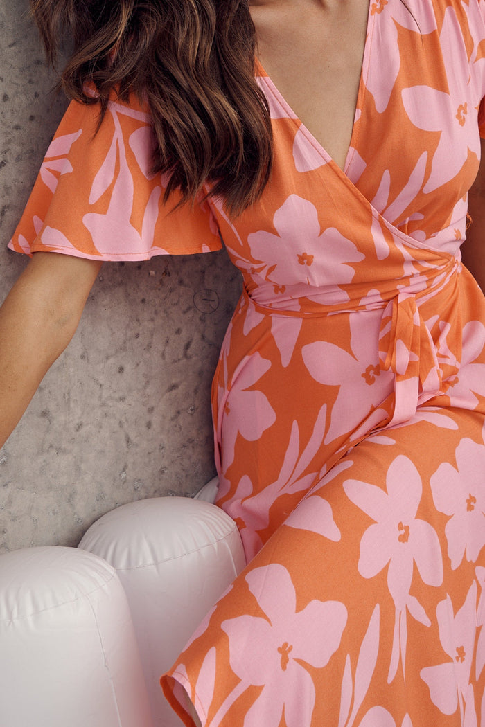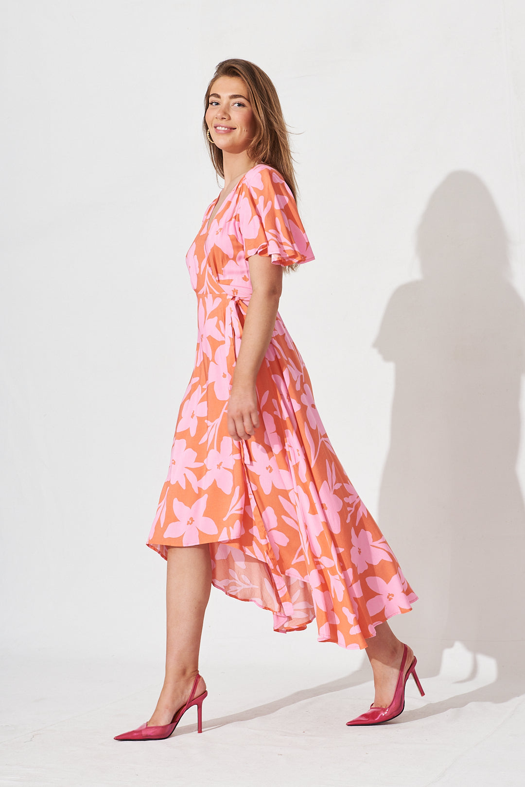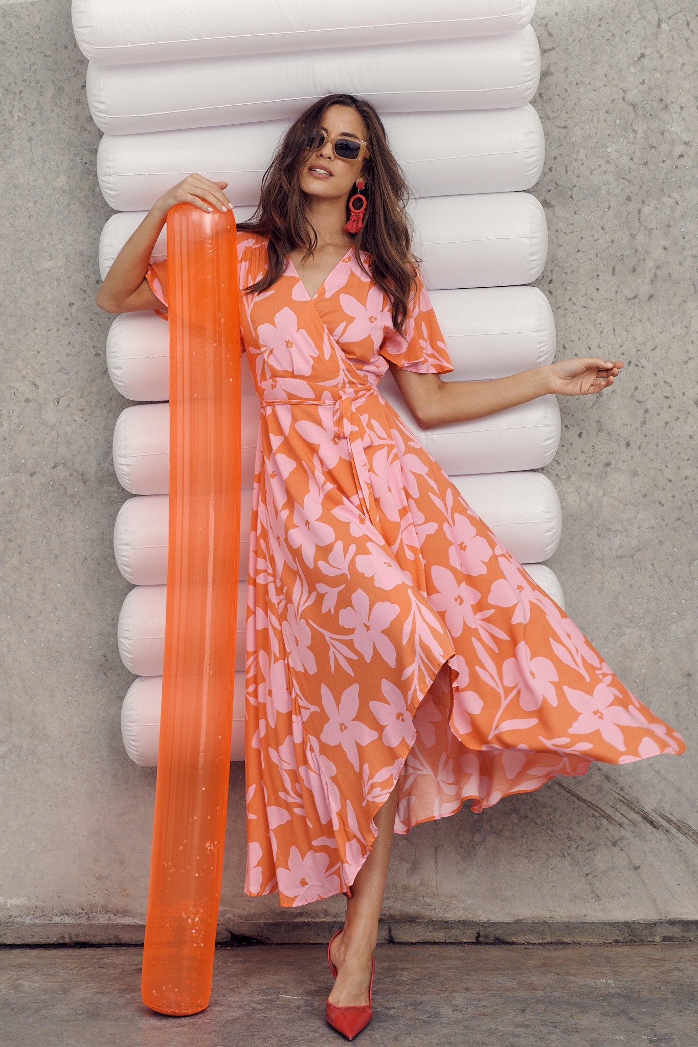 Sanctuary Midi Wrap Dress In Orange And Pink Floral