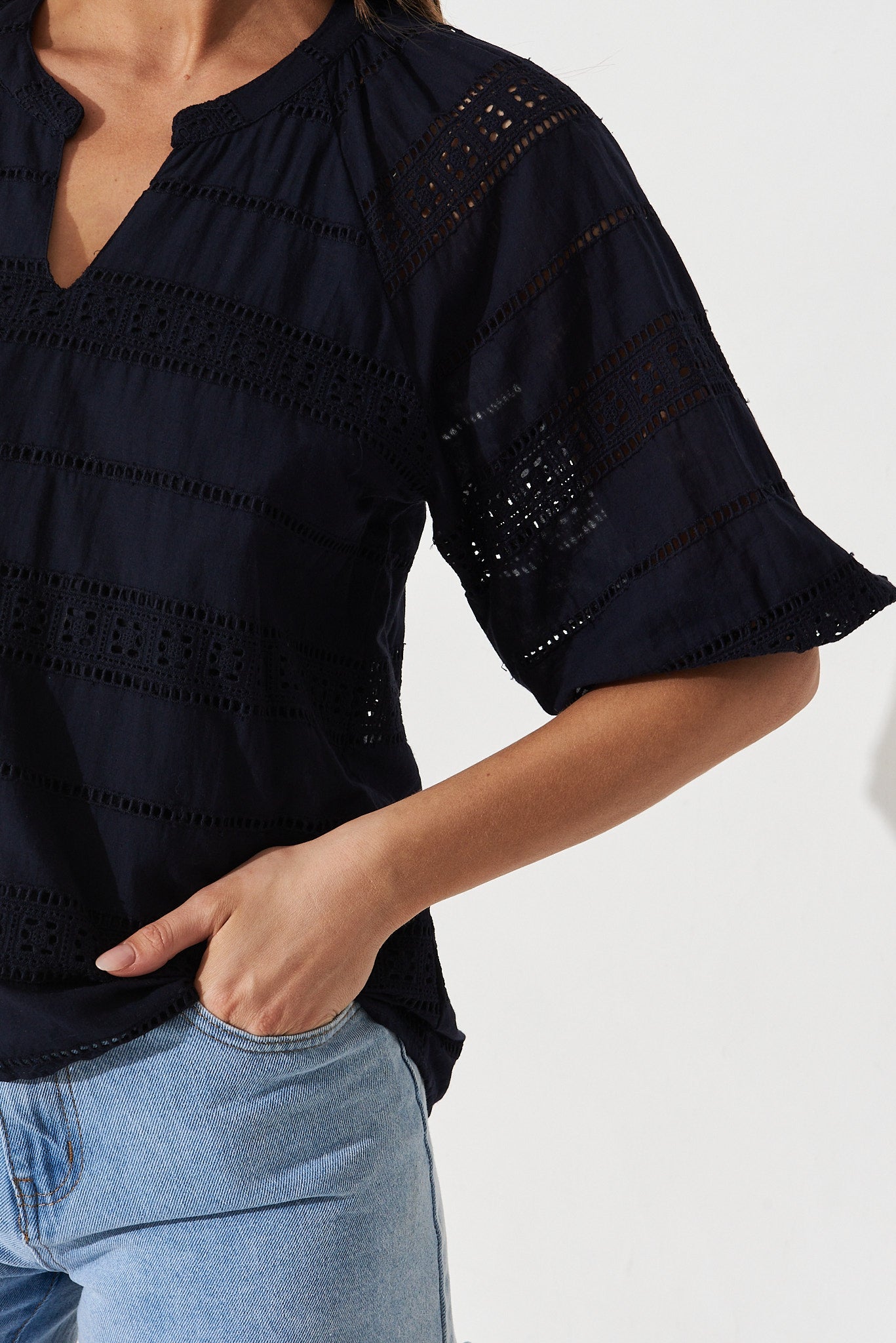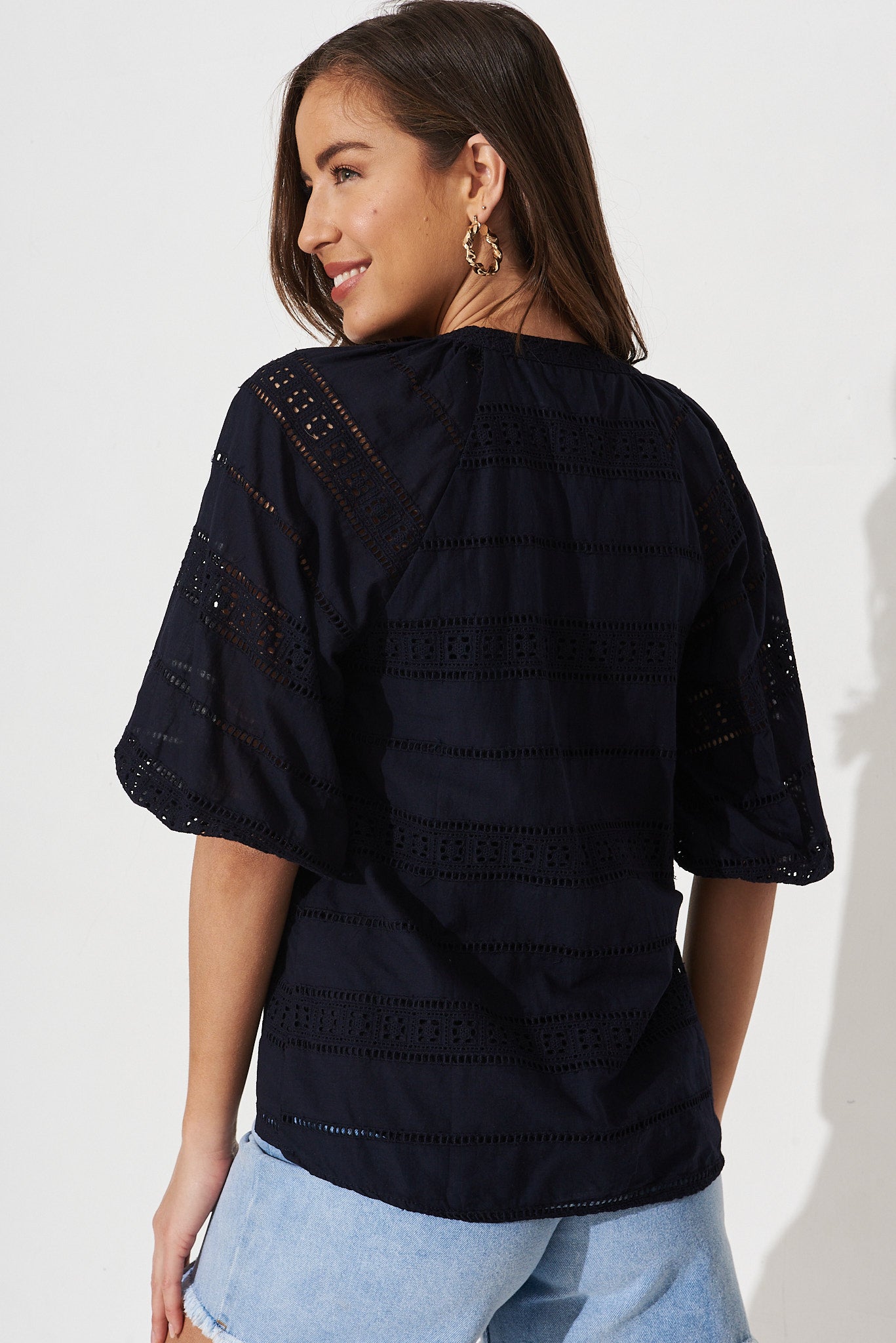 Our fail-safe way to make a classic top Uber-stylish? Make it all about the details. Like our Winda Top! Featuring semi-fitted, puff-sleeve, v-neck with mandarin collar & its beautiful broderie detail finish.